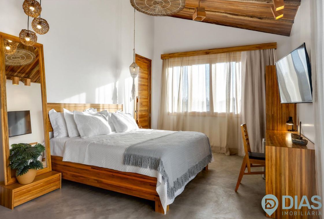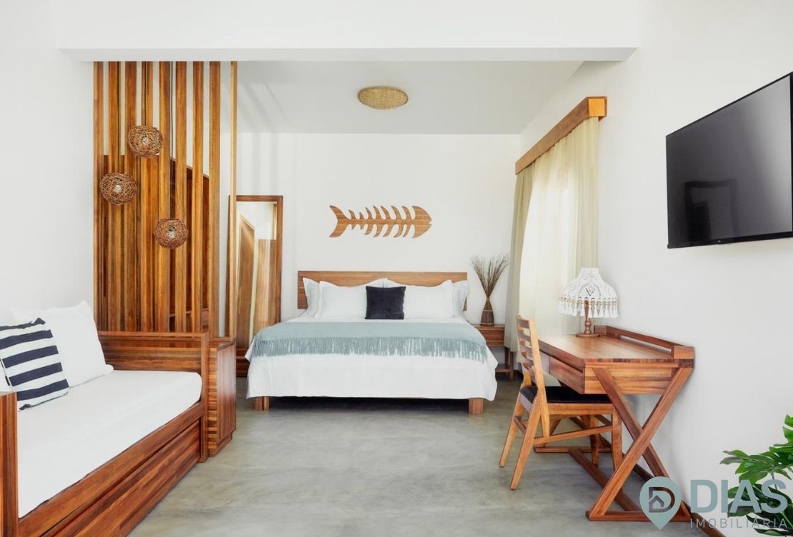 1 Suíte medindo 27 m², com varanda e vista para o mar e a piscina