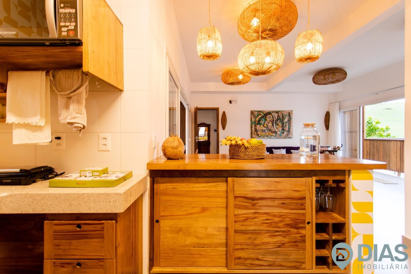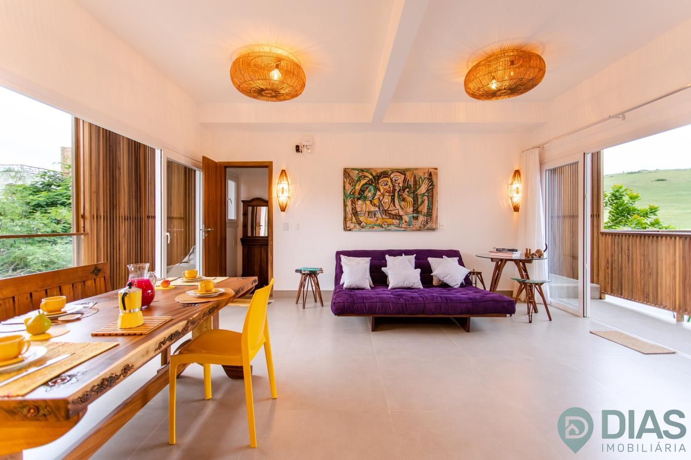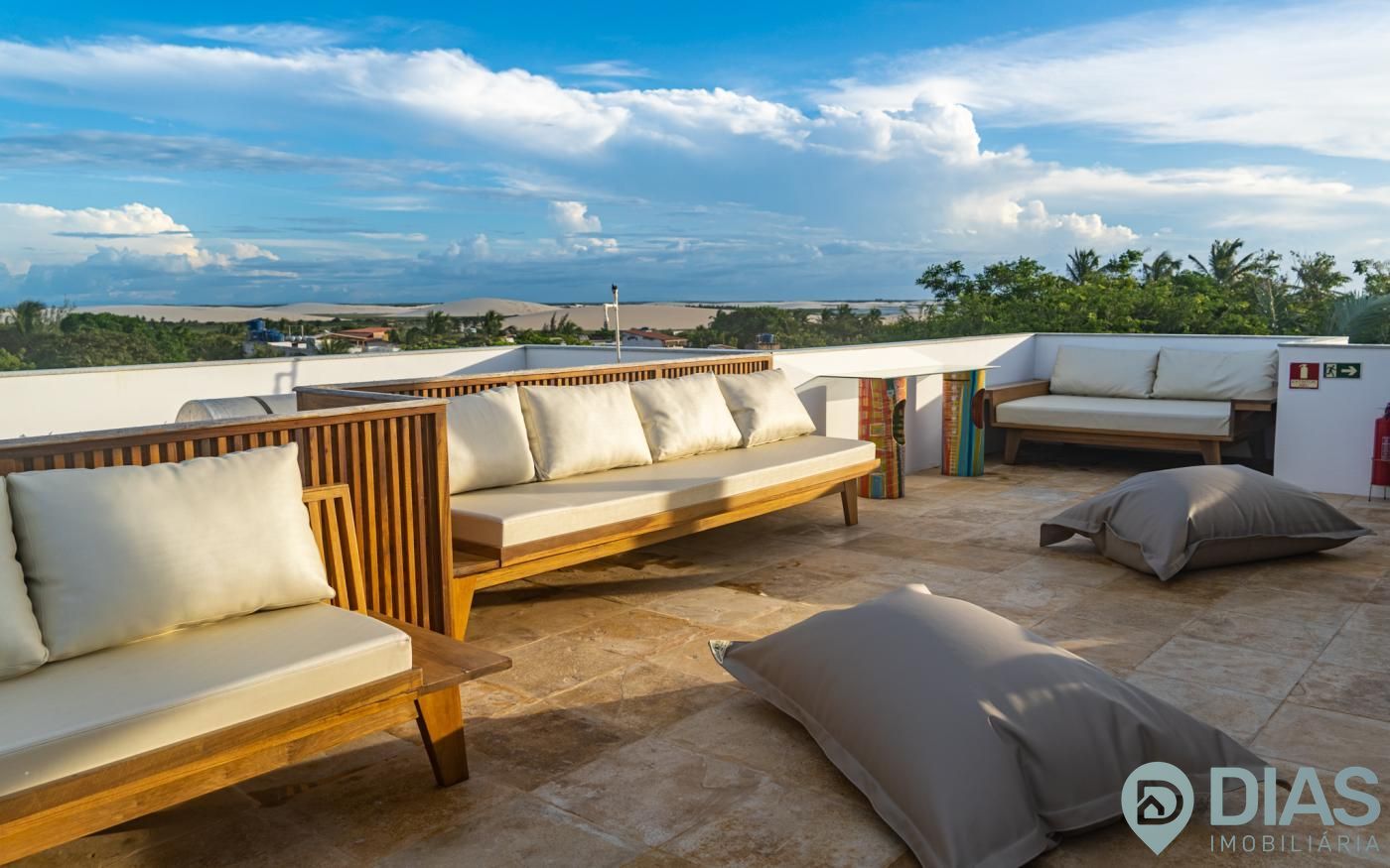 A sala é ampla e conjugada com a cozinha, tornando-a ainda mais agradável com o aproveitamento da ventilação e luz natural, interligada com uma ampla sacada que tem cortina estilo 'madeira ripada' que, ao estar fechada, da total privacidade ao morador e ao abri-la tem uma vista para as belezas da Vila de Jeri.