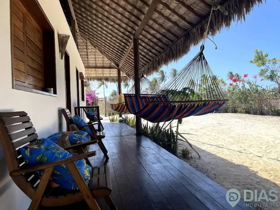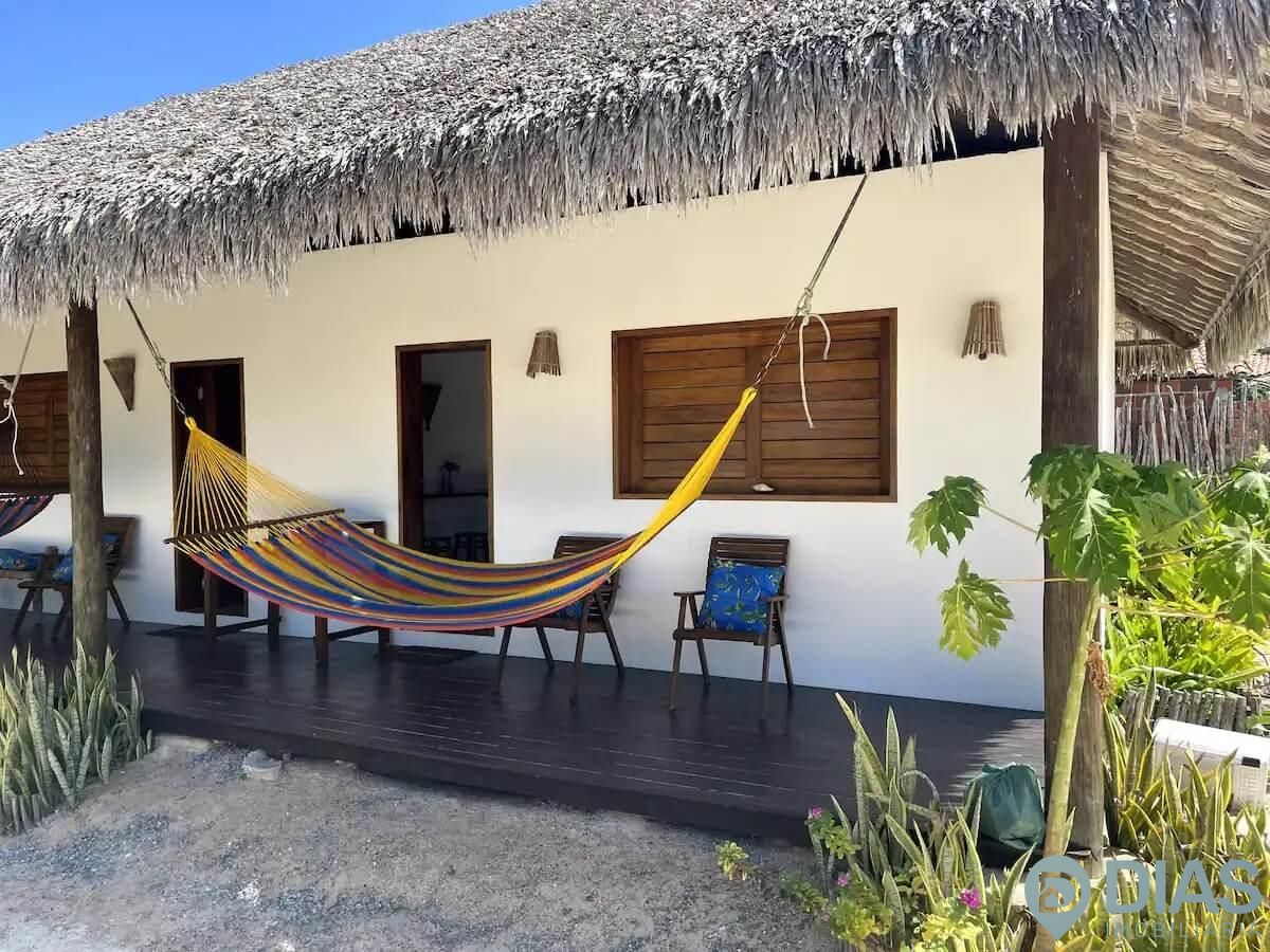 Com bangalô dividido em 2 quartos privativos simétricos separados um do outro, e na área externa do terreno você pode relaxar nas redes, debaixo de um coqueiro ou tomar sol na areia se desejar.